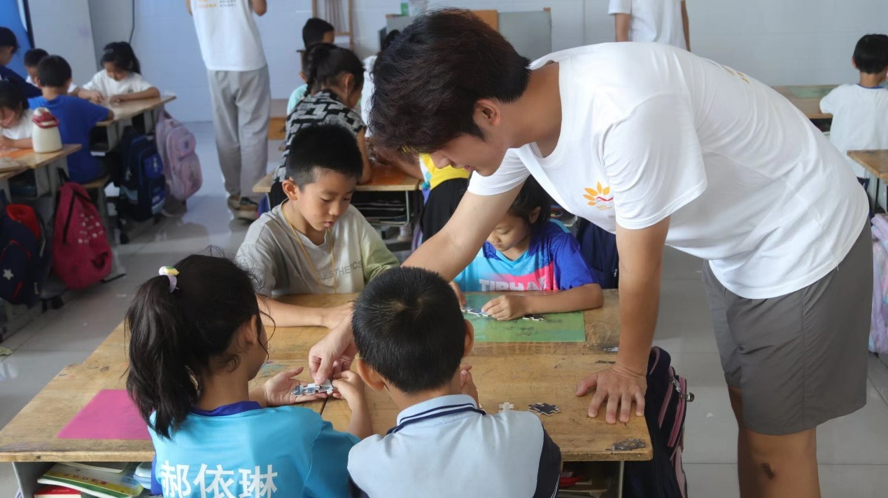 为了让课堂更加有趣,让孩子们对红色文化有更加深刻的了解。实践团成员还精心准备了互动环节,他们事先把在临沂博物馆拍摄的红色革命文物照片做成一份份文物拼图,这样不仅考验了孩子们的手眼协调能力,更激发了他们对历史文物的浓厚兴趣。孩子们拿起一块块拼图,小心翼翼地拼凑着,仿佛穿越历史的长河,亲手触摸那些革命的痕迹。在欢声笑语中,一幅幅承载着厚重历史的文物图像逐渐在孩子们的手中复原,孩子们的成就感与自豪感油然而生。 图为实践团成员指导孩子们拼图。山东理工大学赵一提供