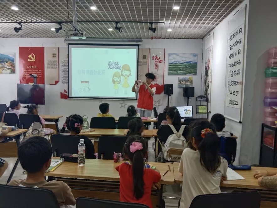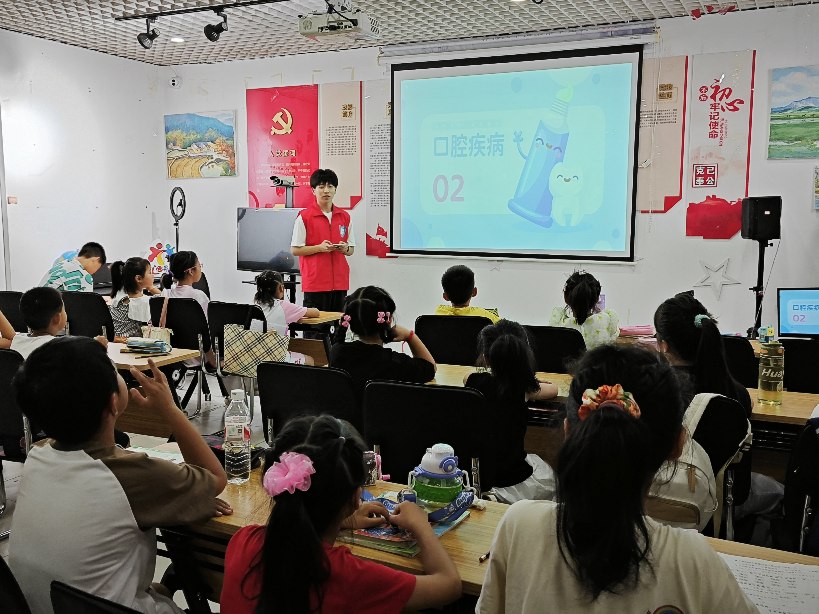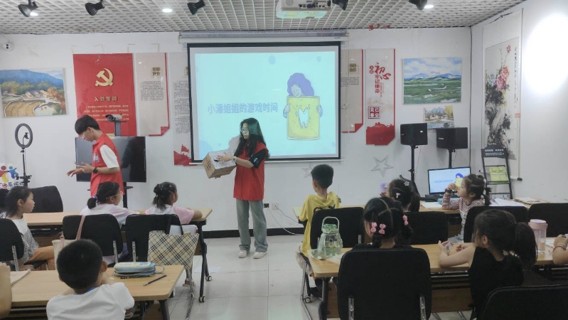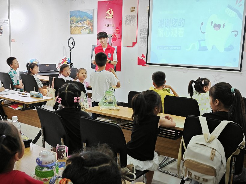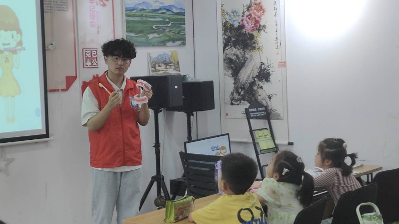 (江苏医药职业学院医学院7 月29日讯)(通讯员:潘静怡)7月29日上午,江苏医药职业学院口腔医学2301班“健康科普.赋能乡村”社会实践团赴江苏省徐州市鼓楼区九里新苑社区开展了一次精彩生动的“口腔健康科普”暑期社会实践活动。宣讲团负责人秉持“呵护口腔健康,科普从我做起”的信念,积极组织团队成员开展本次活动。团队成员分工明确,通过志愿宣讲、游戏互动、现场演示、问卷调查等多种形式为小朋友们以及社区居民带来口腔健康知识。