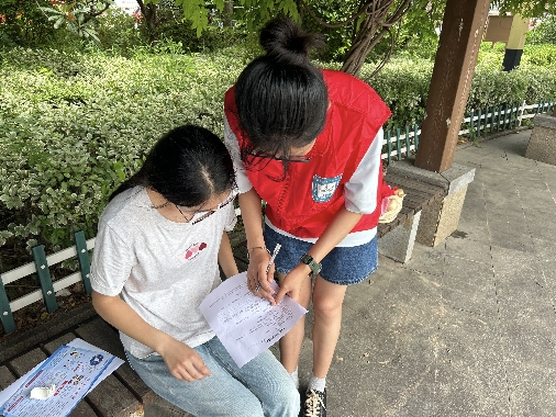 第四个环节,志愿者们在社区中以问卷的形式随机调研,对当地社区居民的口腔健康问题有了一个初步的了解认知。之后,团队成员们向当地居民发放了宣传手册,并采用大众喜闻乐见的聊天形式,热情、积极地回答群众的问题,同时为有口腔问题困扰的居民们解惑。