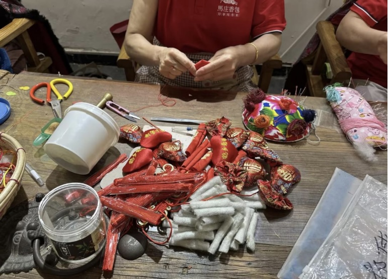 马庄香包,这一承载着非物质文化遗产光环的瑰宝,其制作工艺独树一帜,尽显非凡。据奶奶们介绍,制包人根据祖传秘方,选取数十种散发自然芳香且具有养气调神、避邪功用的中药材,如白芷、佩兰、丁香、菖蒲、柴胡、薄荷等,以及若干保密成分,经过特殊加工后成为香包的主要原料,使香包散发出馥郁且独特的芬芳。初闻时便给人一种提神醒脑的感觉,细嗅之下,那丝丝缕缕的草药香沁人心脾,对人体健康大有裨益。从外观来看,马庄香包运用的图案种类繁多,既有民俗寓意的祝福吉祥图语,也有生动的花草纹案,且香包多采用明亮的颜色,色彩对比鲜明,有华丽之美。更为精妙的是,马庄香包的缝制过程运用了多达十余种古老而精湛的针法,每一种针法都凝聚了匠人们的心血与智慧,使得香包在结构上既牢固耐用,又在细节处透露出无与伦比的精致与匠心。这种将实用性与美学设计完美融合的特质,正是马庄香包深受人们喜爱与推崇的重要原因。