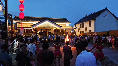 18日傍晚,小队成员着手做菜,在烟火气中恣意汗水,在唰唰菜刀声、嚓嚓炒菜声中展现厨艺,在忙中有序里完成丰盛一餐。夜晚小队成员参与高山流水长桌宴的篝火晚会,“一步走,二步抬手,三步转,四步踢”主持人身穿畲族服装积极带动大家跳舞情绪,篝火的火苗也同人一般起舞,淡白色的炊烟在黑夜里显得格外耀眼,弯弯曲曲的引到圆月去,渐渐加速的步伐和渐强的歌舞声,小队成员围着篝火跳舞愈发轻快,似乎要直奔月亮上的舞台。