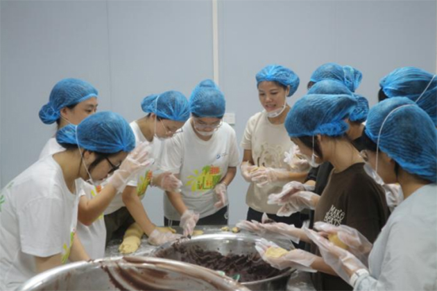 队伍通过“非遗之光·怡吉饼香”传统文化体验课程,引领学生们走进合水非遗老字号怡吉饼厂,亲身感受月饼制作的古老技艺。服务队队员与当地学生共同探寻百年非遗月饼传承故事,并化身为“非遗小传人”,以沉浸式、体验式的教学方式,让学生们感受月饼制作的传统工艺,更深耕非物质文化遗产所蕴含的深厚文化底蕴与价值。从基础的和面技巧学起,再到精细的包馅手法,最后亲手将月饼送入烘烤炉中,此次月饼制作实践体验之旅,加强了学生对非遗文化与家乡美食的热爱、对乡愁味道的深刻体会,促进合水非物质文化遗产在年轻一代中得到更好的保护传承。