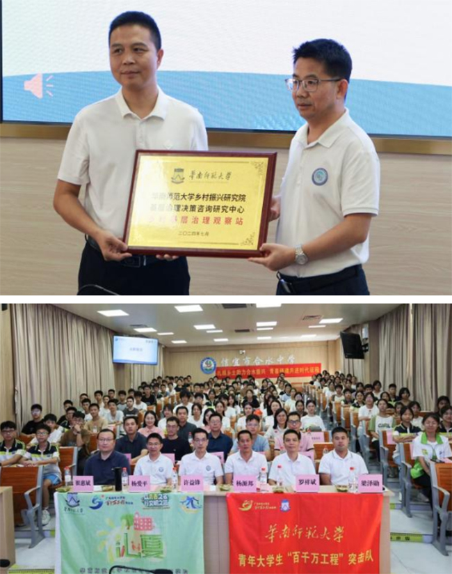 (四)“校地联动+治理”:中心搭桥,构建校地发展“共同体” 7月24日,沁夏风“茂”突击队在政治与公共管理学院指导下举办“校地共建,奋进双百”百千万工程交流活动暨华南师范大学沁夏风“茂”突击队结营仪式。经过此次下乡行和校地合作交流会与合水所结下的缘分,专家领导就双方长期合作共建进行了深入的交流,共同达成在合水镇横水村设立华师乡村振兴研究院基层治理决策咨询研究中心乡村基层治理观察站的意愿,并举行了授牌仪式。