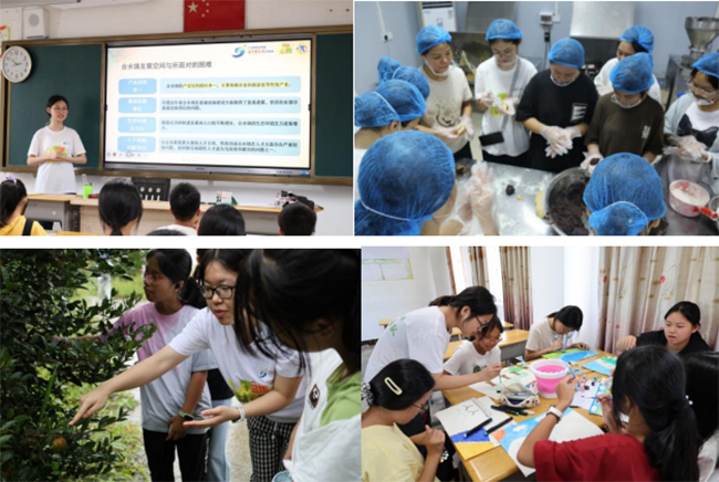(二)“文化+治理”:文化“治”囊,描绘乡土文化“新底色” 突击队于信宜市合水镇合水中学开展暑期团校夏令营,以期提高青少年理想信念,促进本土学生将个人成长与乡村发展紧密结合。通过将乡土文化符号、文化情感、文化行为植入综合实践活动课程,打造五大“合水角色体验营”,包括“乡土小诗人”——诗韵乡音颂合水;“非遗小传人”——文化传承深底蕴;“家乡小导游”——乡景导赏促文旅;“特色产业家”——产业策划谋发展;“我是治理者”——绘梦乡土共治理,开展课程35节,面向合水当地学生1000余人次。促进合水当地青少年在文化情感植入综合实践活动课程以及社会角色体验的过程中、乡风文明与理想信念的浸染中厚植乡土情怀,发挥文化铸魂育民的作用以提高其参与产业发展、社会治理的积极性与能动性,为合水镇当地发展注入新生力量。