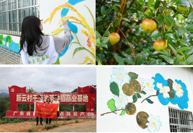 实践生发理论,理论哺育实践。沁夏风“茂”突击队将乡村治理活动实践化、可视化,在“油茶之乡”信宜市合水镇紧跟当地“一村一品、一镇一业”油茶特色专业镇的发展需求,为合水品牌产业寻矩阵、做宣传、育意识、绘风景,通过制作油茶宣传视频、“油茶森林小镇”宣传册以及“油茶产业连环画”特色墙绘,助力横水河“一河两岸”人居环境整治,美化村容村貌,将乡村产业之美与基层治理相结合,打造“人和景美,产业兴村”的乡村产业风景线,有意识有方向的推动合水油茶“产业+治理”振兴发展。