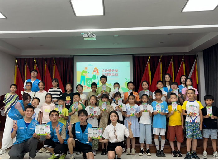 图为实践成员与小朋友宣传垃圾分类合影 王欣 供图