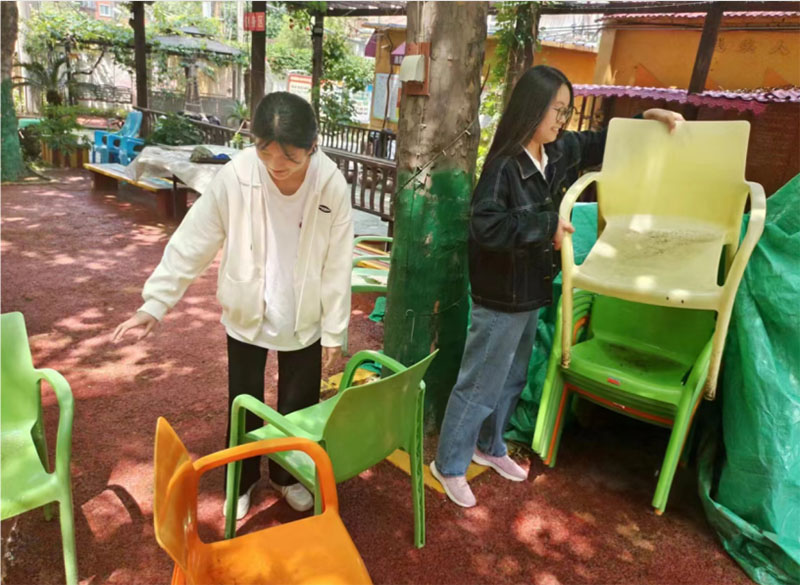 志愿者们分成小组,分别负责打扫室内和室外卫生。他们有的扫地、拖地,有的擦窗户、整理床铺,还有的清理垃圾、消毒卫生间。