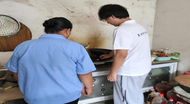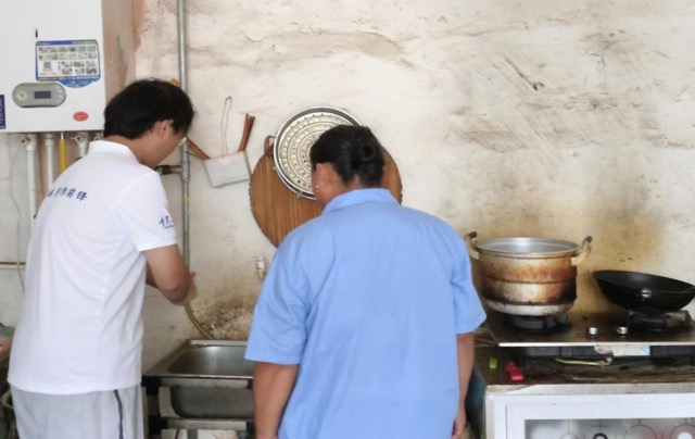 图为实践团成员指导村民上手实践 实践团成员向村民们展示了天然气灶的正确安装方式,强调了距离可燃物至少一米以上的安全距离,并确保灶具安装在通风良好的环境中。接着详细解释了天然气灶的使用步骤,并特别强调了相关注意事项如保持通风、定期检查燃气管道和灶具等等,确保村民听懂、学会,保证村民的生命财产安全。