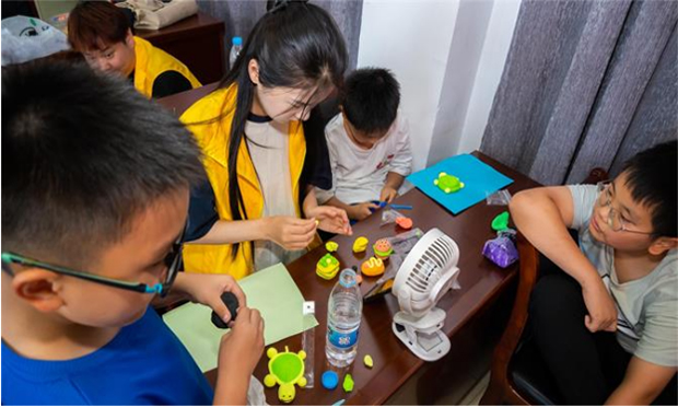 在于科学课程中,团队成员借助充满趣味的泡泡龙科学实验,令学生们在亲身实践中体悟泡泡表面张力的存在,于竖状泡沫中观测水分子里氢原子的相互作用力。充分激发学生的好奇心与探索欲,培育科学思维。同时,开展剪纸和捏橡皮泥手工互动活动,团队成员激励并协助学生进行自主创造与设计,充分调动学生的想象力与创造力,创作出各类新奇富满童趣的作品。