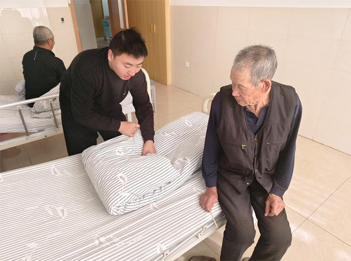 图为爱心敬老者团队成员马荣鑫为老人整理床铺