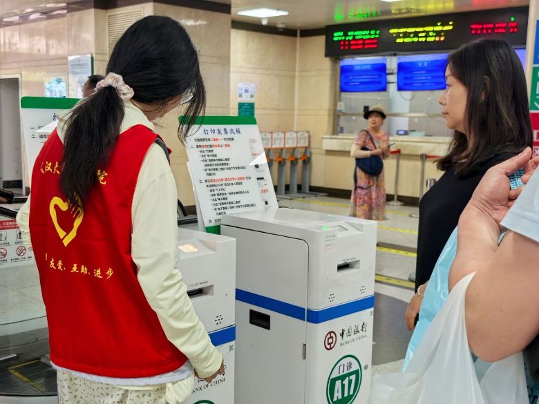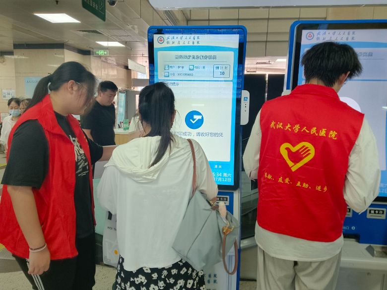 活动中,实践队成员在带队老师的指导下,明确分工,迅速投入工作。他们在门诊大厅咨询台、各楼层扶梯口及科室门口等关键位置设立服务点,主动询问患者需求,耐心指引就诊地点,详细告知就诊流程,帮助患者高效完成就医。此外,成员们还在自助挂号机、缴费机及报告打印机旁专人值守,手把手指导患者操作设备,显著提升了门诊服务效率,缓解了窗口压力。