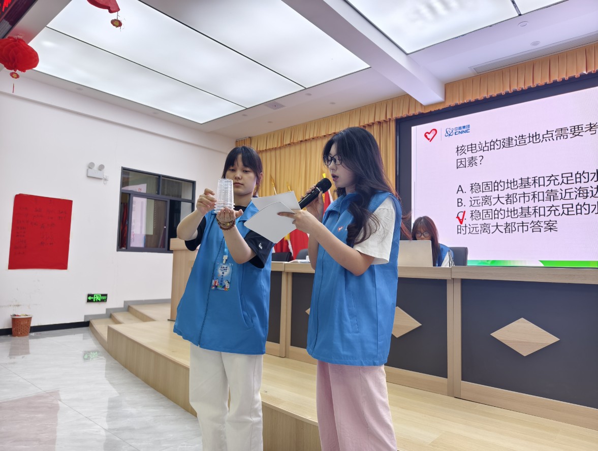 课堂现场气氛活跃,宣讲团成员用道具模拟核电站是如何保证安全的,便于学生理解。