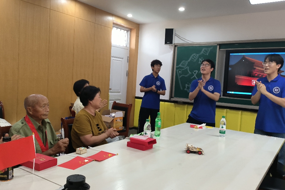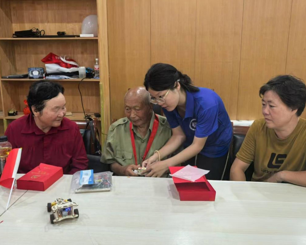 宣讲团成员们精心策划,团队成员通过展示自主研发制作的可转向赛车,耐心讲解其运作原理,并邀请老人们亲手操作体验。新奇有趣的科技产品激发了老人们的浓厚兴趣,在轻松愉快的互动中,宣讲团成员带领村中老人体验科技魅力,将朋辈教育的种子播撒在更广阔的年龄层。