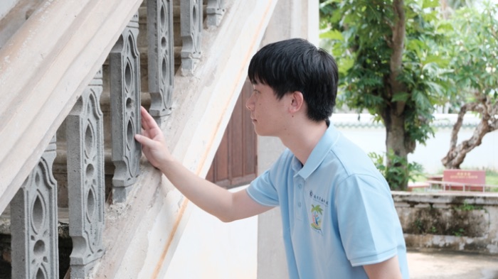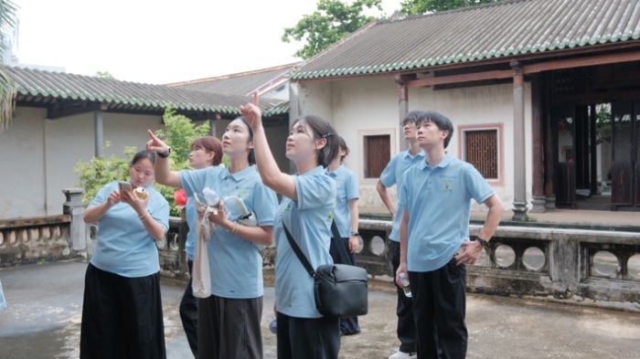 图为海南大学海德书院椰韵绘彩支教服务实践团成员在溪北书院欣赏古建筑,感受百年文脉的温度