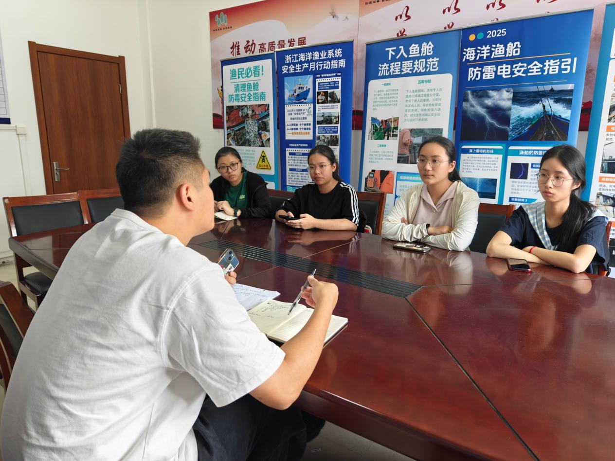 三、渔业新声:聆听传统渔业的转型故事 午后咸腥的海风中,调研最后一站直抵高塘渔办。墙上的渔汛图与角落堆积的绿色养殖浮球,构成传统渔业转型的隐喻。在这里,团队成员与渔业安全负责人邵轩豪以及老渔民进行交流,初步了解了当地的渔业状况,以及与渔业相关的渔歌号子等非遗如今的发展状态,并共同对接下来与老渔民生活相关的调研作了部署与安排。
