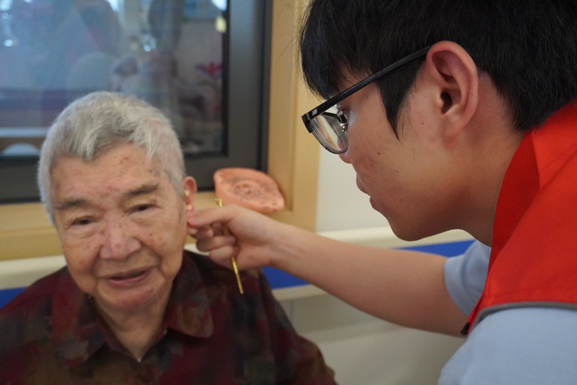 在团队成员向老年人们进行完自我介绍后,活动便正式开始。志愿者团队分为三个小组,每组两人,分别为老年人们同步进行跌倒风险问卷调查及身体运动能力评估。在其他老人们进行评估的时候,志愿者为旁边空闲着的老年人们进行了传统中医“耳穴压豆”的服务体验,以达到疏通经络、平衡阴阳的功效。