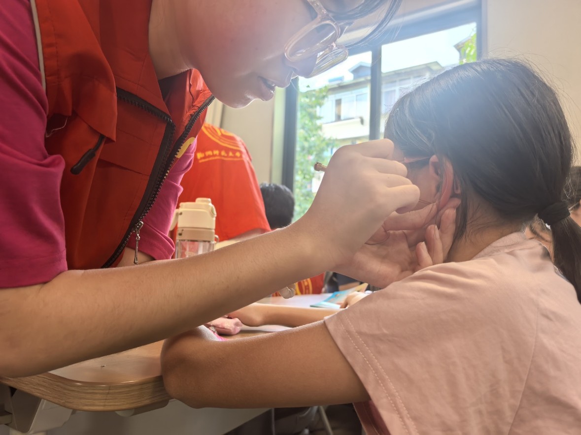 在耳穴压豆体验环节,小朋友们踊跃参与。实践团队成员向大家介绍了耳穴压豆这种传统中医疗法的神奇功效,并在专业指导下,小心翼翼地为小朋友们贴上王不留行籽,刺激耳部穴位。小朋友们新奇又兴奋,现场气氛热烈非凡。据了解,耳穴压豆是通过将小型颗粒状物体粘附在耳部穴位上来刺激穴位的中医治疗方法,通常不会引起明显疼痛,对日常生活影响较小。