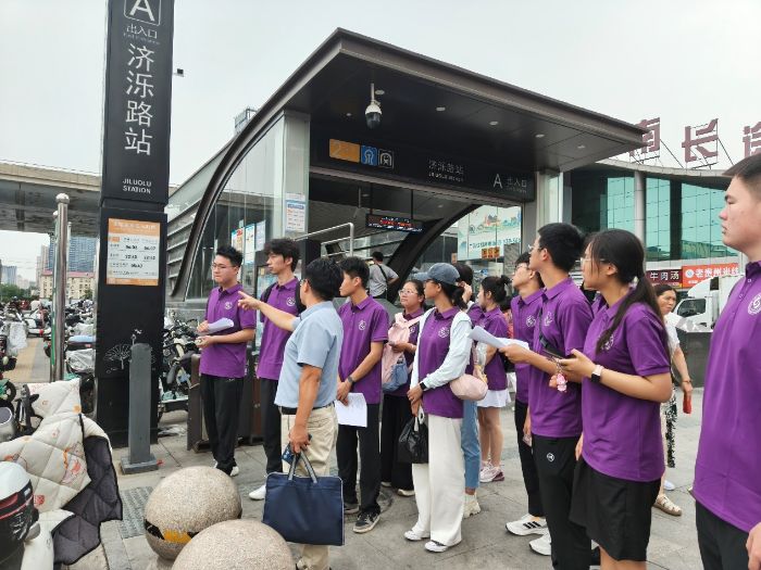 随后,指导老师带领团队与济泺路站工作人员进行沟通,示范了如何高效获取站点运营信息,并现场演示面向乘客的问卷发放与回收技巧,为团队成员提供了清晰的实践指引。