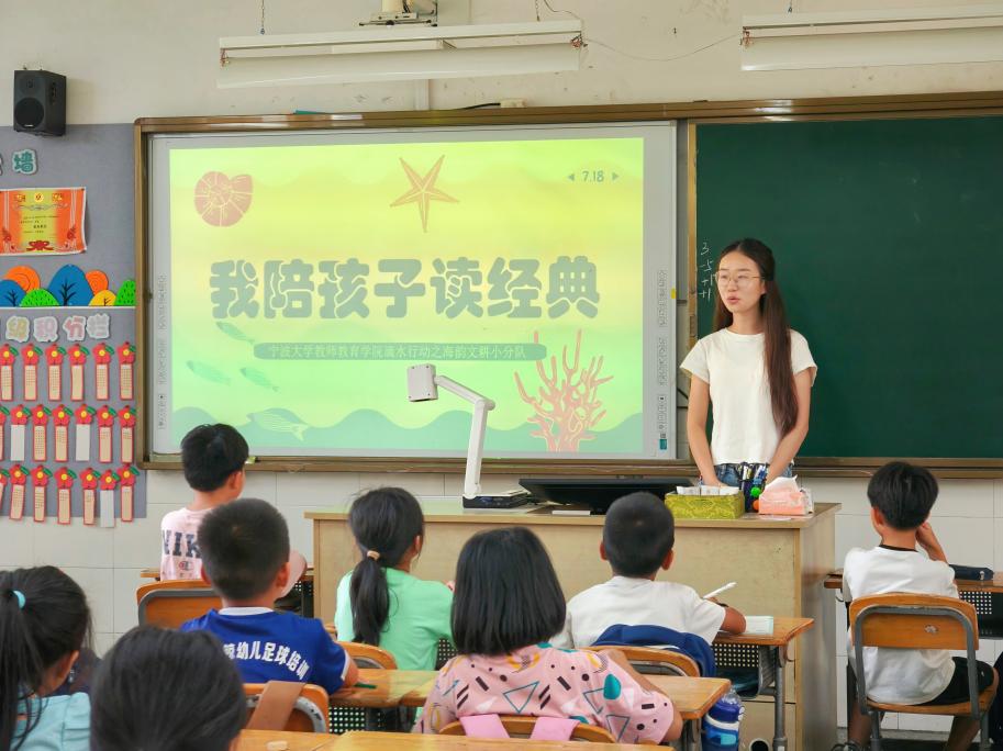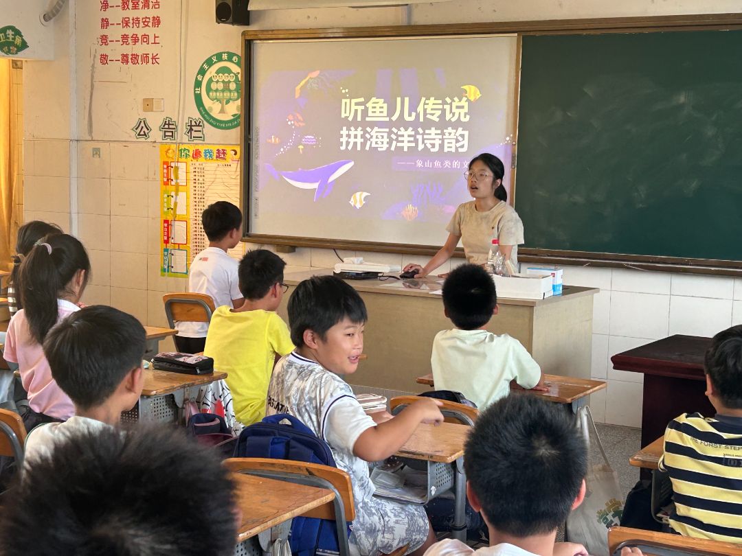 清晨的微风轻抚着象山县高塘岛的校园,高塘学校的教室里洋溢着孩子们的欢声笑语。在假日学校的第五天,宁波大学教师教育学院"滴水行动"海韵文耕小分队为孩子们精心准备了四堂别具特色的海洋主题课程。这些课程以科学启蒙、文学熏陶、视听体验和艺术创作为主线,志愿者们用热情与创意,带领孩子们开启了一场探索海洋奥秘的奇妙之旅。