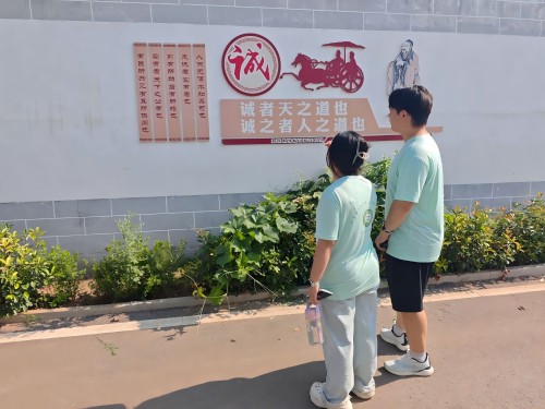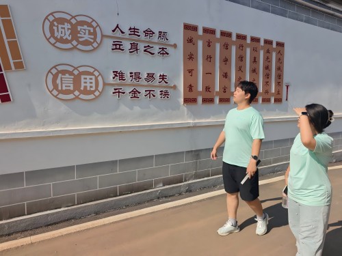 沿文化街行进,实践团成员对墙上的诚信主题内容展开重点考察。其中,“诚实,人生命脉,立身之本;信用,难得易失,千金不换”等内容,以简洁凝练的表述,深刻阐释诚信对个体生命的关键意义。针对其核心内涵,实践团成员进行深入交流研讨。