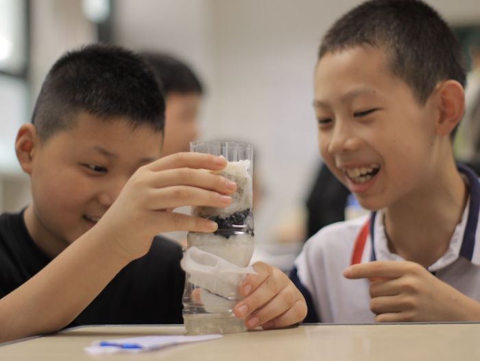 最令人期待的当属自制净水器环节。在队员们的指导下,同学们分组合作,将活性炭、石英砂、蓬松棉等材料依次装入空瓶中,仔细搭建过滤装置。当大家将模拟的“污水”倒入自制净水器,看着浑浊液体慢慢变得清澈时,纷纷发出惊喜的赞叹。过程中,队员们还耐心解答“不同材料有什么作用”“过滤后的水能不能直接喝”等问题,让科学知识在实践中落地生根。