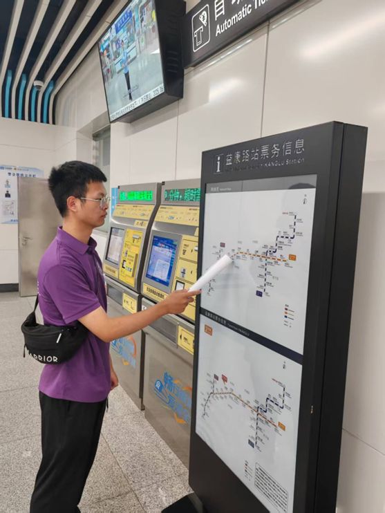 实践团成员采用“观察+体验+随机采访”模式,重点记录各站点动态导视系统、盲道及无障碍电梯等设施的配置与使用情况。针对换乘通道长度、标识牌及多语言提示等细节,成员通过步行计时、多角度拍摄等方式留存实证资料。同时,团队随机选取不同时段乘坐2号线,实地测算高峰时段站内换乘耗时。