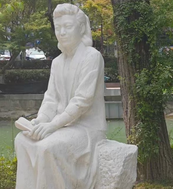 王莹雕塑,通体汉白玉雕刻而成,雕塑背面刻有“艺坛才女、巾帼先驱”,由阳翰笙题写。王莹,1913年出生于安徽芜湖,原名喻志华,曾用名王克勤。她是中国话剧、电影演员、女作家,毕业于上海艺术大学文学系。1930年加入中国共产党,先后参加辛酉剧社、上海业余剧人协会等左翼进步戏剧社团。王莹作为话剧和电影表演艺术家,在民族危亡之际,没有局限于个人演艺事业,而是将艺术与革命紧密结合。她投身抗日救国洪流,通过主演话剧、电影传递爱国情怀,更在南洋开展募捐演出,用实际行动支援祖国抗战。这种以艺术为武器,为民族解放呐喊、为国家存亡奔走的担当,正是革命精神中“以己之长,为国效力”的生动体现。