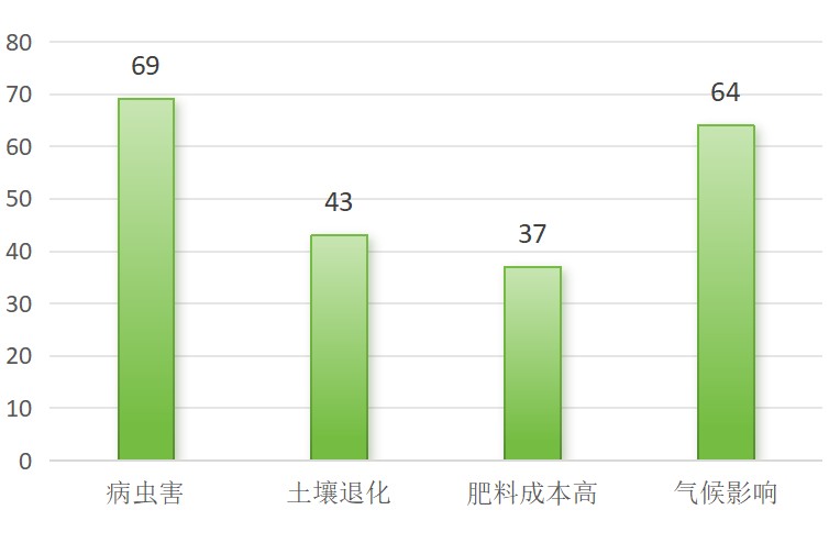调查结果显示,陀村农户种植面临的主要挑战病虫害和气候影响占比较高,土壤退化和肥料成本高次之。农户对绿原酸类肥料减少农药使用的感兴趣程度较高。