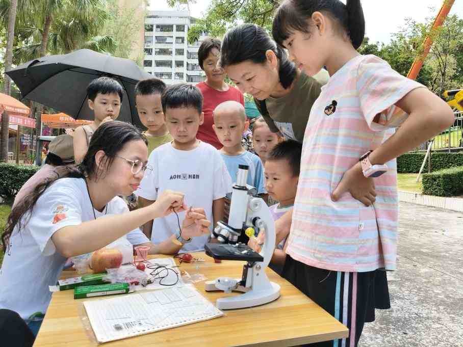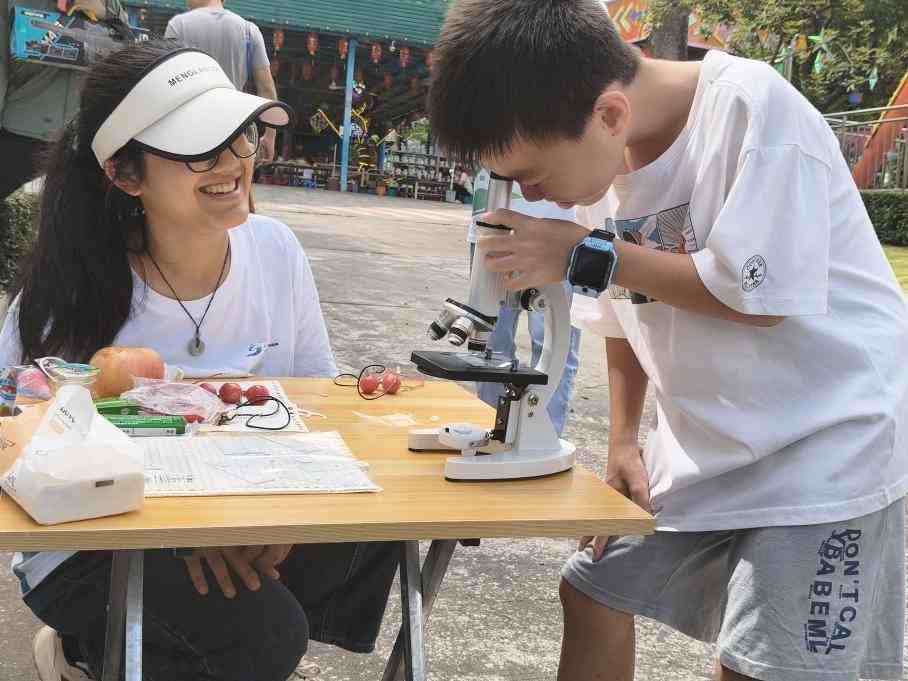 “显微镜探索”区更是人气爆棚。队员们准备了洋葱表皮、山楂切片等多种玻片标本,孩子们在队员们的耐心讲解下,学习显微镜的使用方法。