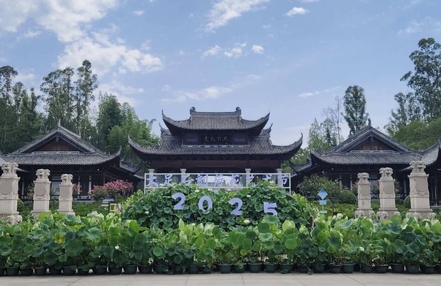 调研当日,虽暑气蒸腾,大足石刻却自有清幽。实践队成员到达游客中心后,一同乘坐大巴驶入景区。沿途石桥荷花盛放,“天下大足”楼宇逐渐清晰。新增设的“荷花艺术节”打卡点为石刻增添了几分生机,也为游客带来了更多体验。