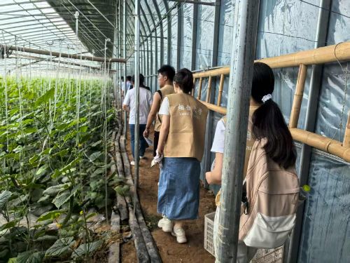 活动伊始,实践队抵达骇河甜源联合党委党群服务中心。在服务中心工作人员的引导下,队员们观看宣传片,深入了解骇河甜源的整体布局、种植规模及核心产业方向。走进连片的黄瓜大棚,看着棚内藤蔓间挂满饱满的果实,队员们俯身观察滴灌管道的铺设走向,仔细询问温湿度调控设备的运行原理,不时用手机记录下智能化灌溉设施与作物生长状态的联动细节,深入研究这套既节水又能保障作物品质的生长系统。