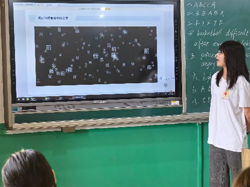 在"心为善使 博爱红十"环节,团队精心设计了四个特色模块,在"红十字会百年历程"环节,志愿者牛禹默讲述红十字运动的起源与发展,通过历史照片展示人道主义精神的全球传承,用中俄双语阐释红十字的基本原则;"多语种急救术语"环节则发挥专业优势,教授学生中、英、法、日多种语言的急救呼叫用语;"国际人道援助"部分通过模拟联合国救援场景,让学生体验语言在灾难救援中的桥梁作用。最后以视频和现实演示结合的方式科普了一些主要急救知识,增强了孩子们面对紧急情况时的应对能力。