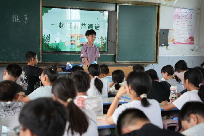 实践队队员辛静微以“普通话的意义”为主题,深入阐释了普通话作为国家通用语言在消除沟通障碍、促进社会交往中的基础性作用。课堂上,学生们通过对比方言与普通话发音差异,直观体会到语言统一的重要性。学生主动翻查字典核对平翘舌音,在笔记中重点标注“规范发音”等细节。学生初步建立起了“普通话沟通更高效”的认知。