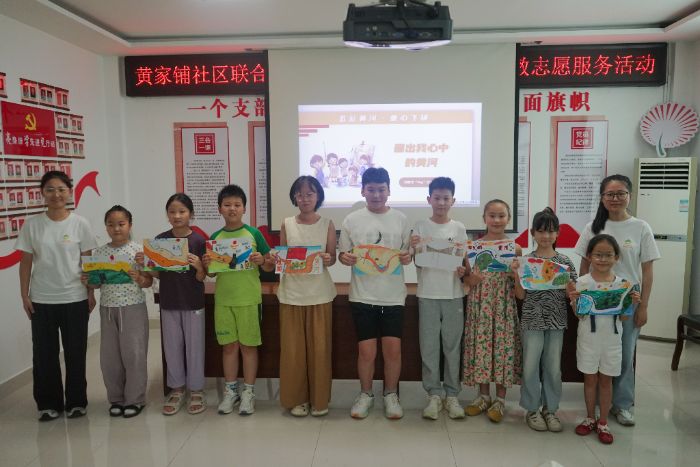 笔绘山河,合影存初心。科普结束后,“绘出心中黄河”活动随即展开。同学们化身小画家,用色彩与线条表达对黄河的想象:有的画下黄河在阳光下波光粼粼的模样,有的画出岸边生机勃勃的草木,还有的将黄河与城市景象结合,充满童趣与创意。画作完成后,大家举着作品并肩合影,画面里,稚嫩的画作与灿烂的笑容交相辉映,成为对黄河之爱最直观的表达。