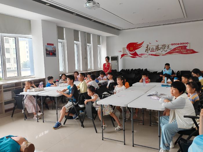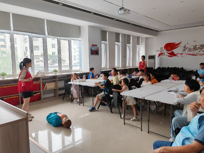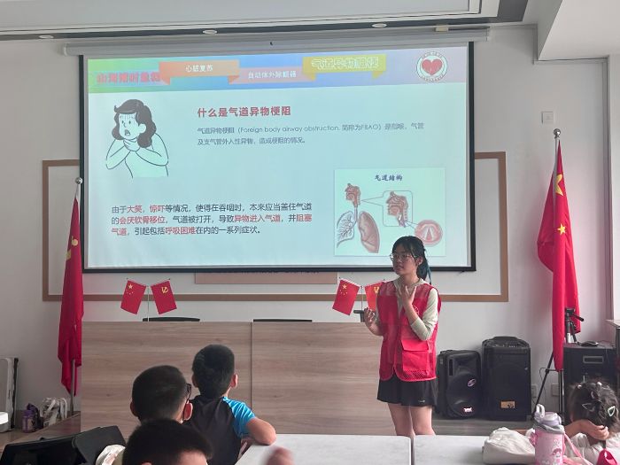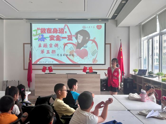 7月24日上午,威海市环翠区怡园街道滨州街社区的活动室里热闹非凡,30余名小学生齐聚一堂,参加“救在身边,安全一夏”主题宣讲第三期活动。山东大学“博时急救”宣传团的志愿者们,带着生动的教具和趣味互动,为孩子们普及海姆立克急救法,教大家应对气道异物梗阻这一夏季常见意外。5