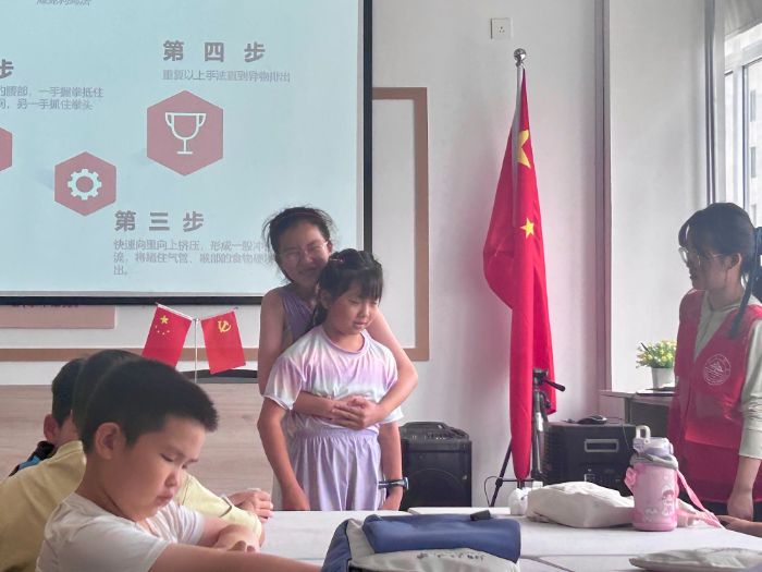 接着在志愿者的指导下对着模拟人练习:“要用力向上挤,就像要把肚子里的‘气球’挤爆吗?”“对啦,就是这样!”志愿者笑着纠正她的手势,“拳头位置要准确,不然就没效果啦。”孩子们两人一组互相练习,活动室里不时传来“加油”声,稚嫩的动作里透着认真。