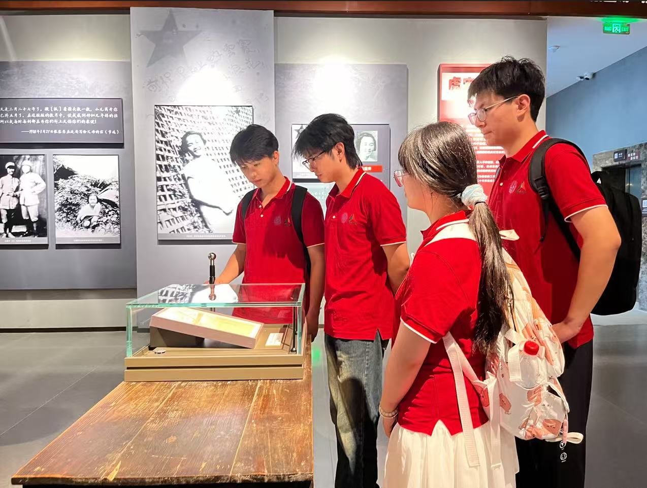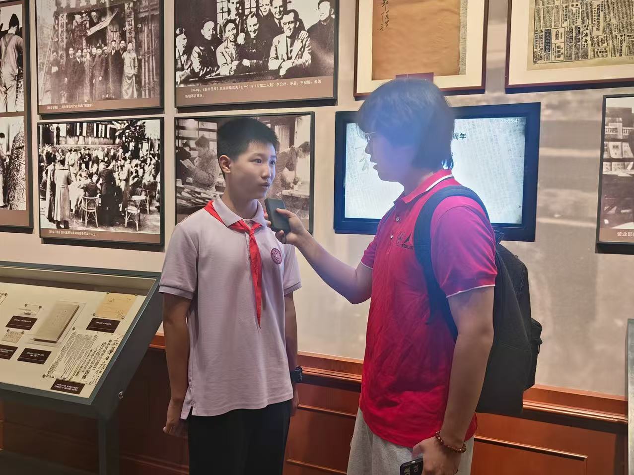 统一战线:民主力量的抗战实践 实践团队于7月16日前往红岩革命纪念馆和中国民主党派历史陈列馆,进一步了解重庆在中国抗战时期的重要作用。在红岩革命纪念馆内,实践队伍与同样前来参观学习的南开(融侨)中学的学生们相遇,展开了一场围绕红色历史与精神传承的友好交流。在交流过程中,王一凡同学谈及自己印象最深刻的展品时,难掩激动之情,他指着那台统一战线时期使用的印刷机向实践队员介绍:“正是靠着它印刷出的一篇篇文章、一份份报刊,让红岩精神在每一个爱国人士的心中生根滋养,让星星点点的抗战星火汇聚成燎原之势,不断点燃全国人民的抗战反击士气。”同时,王同学也提出了自己对于红色文化传承的见解,他表示在新时代背景下,“互联网+”的传播方式相较于传统方式,更能被青少年所接受,也能让青少年更主动地成为红色文化的发言人。实践队员还了解到,包括南开(融侨)中学在内,重庆当地一直在不断探索红色文化新的发扬方式,努力让重庆的红色基因注入每一个在这片土地上的人心中,让红色精神在新时代焕发新的生机与活力。