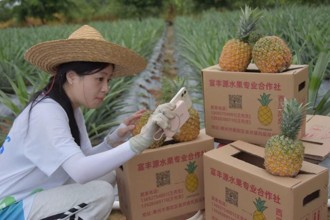 队员在“富丰源水果专业合作社”的凤梨包装箱旁,通过手机直播向网友展示芒果凤梨的色泽与质感。本次“芒果凤梨”专场助农直播将楼角村本土的“芒果凤梨”直接推向消费者。从合作社标准化包装到田间真实采摘场景,镜头里的每一帧都在传递“新鲜直供”的安心感,让香甜的“芒果凤梨”借直播东风,走出乡土,扩大市场。