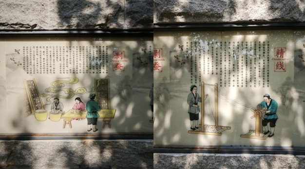 在周村丝绸文化园内,实践团成员依次参观了生丝加工、纺丝、养蚕、剥茧、精线、纺织等传统丝绸制作工艺流程。通过丝绸染织技艺的详细流程介绍,成员们了解学习了从蚕茧到丝绸成品的完整工序,深刻体会到周村丝绸“花形大方、色泽鲜艳、质地坚韧”的独特魅力。展区内陈列的桑蚕丝布料、织绣锦缎民族服装面料和人棉布料一些多样化的丝绸样品,为成员们搭建起直观了解丝绸文化的实践平台,夯实了非遗技艺学习的实物基础。
