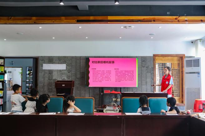 为了进一步加深孩子们对电影人物的理解,赵雪老师邀请孩子们上台表演电影中的经典场景。孩子们分组合作,模仿哪吒和其他角色的动作与台词,通过亲身参与,他们更深刻地感受到了角色的情感与电影的魅力。这一环节不仅锻炼了孩子们的团队协作能力,还增强了他们对艺术作品的感知与理解。