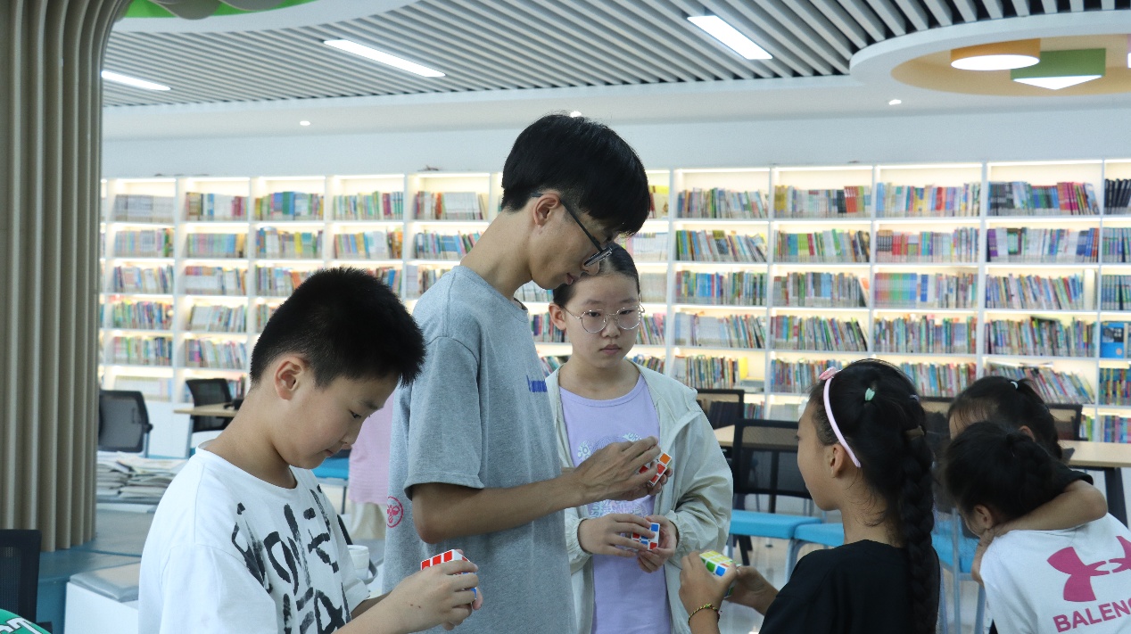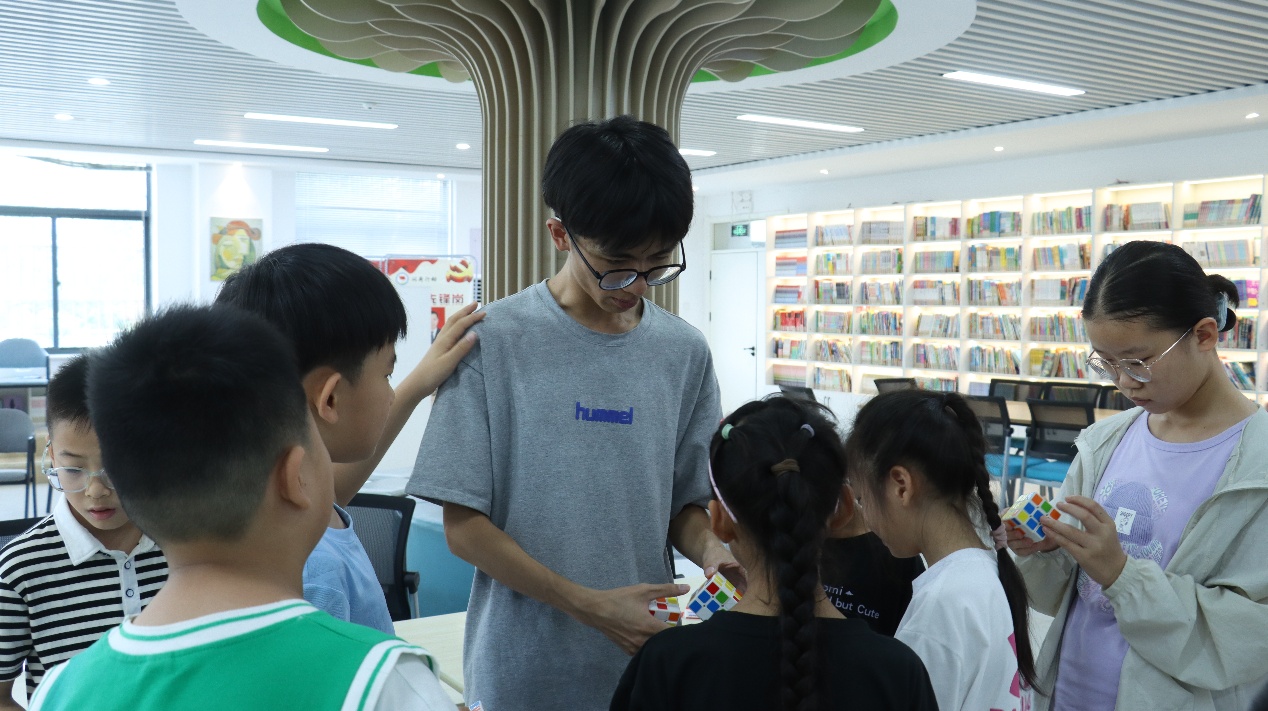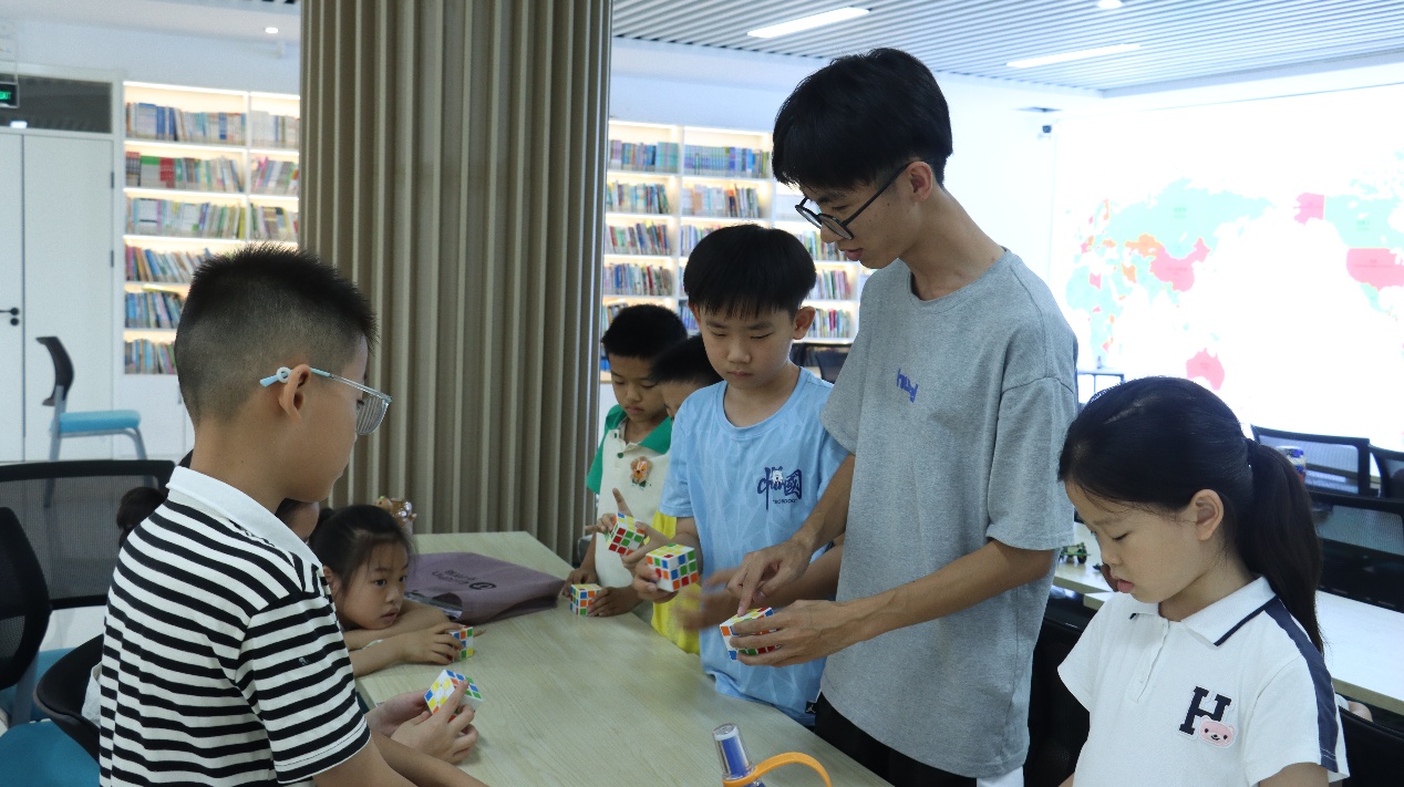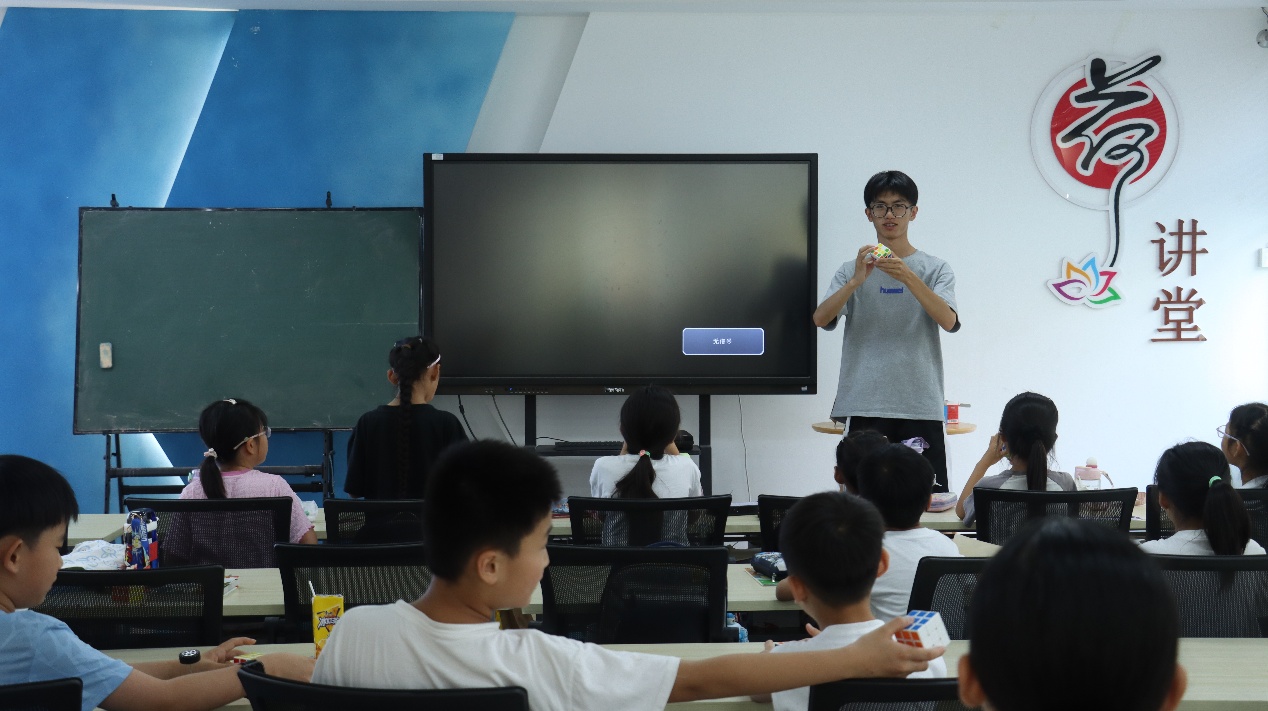 7 月 25日清晨,荷韵小学的活动室里早已洋溢着轻快的气息。阳光透过玻璃窗洒在整齐摆放的课桌上,30 个三阶魔方在晨光中折射出缤纷的色彩 ——“圆梦” 实践团的老师们正忙着做最后的准备,即将为孩子们开启一场奇妙的魔方探索之旅。为了让孩子们在暑假里接触到有趣的智力运动,同时培养空间思维与手眼协调能力,老师提前一周就开始设计教学方案,从魔方的挑选到教学步骤的拆解,每一个细节都反复打磨。