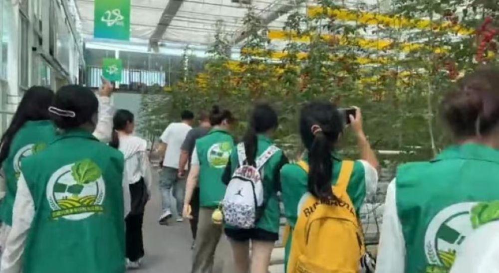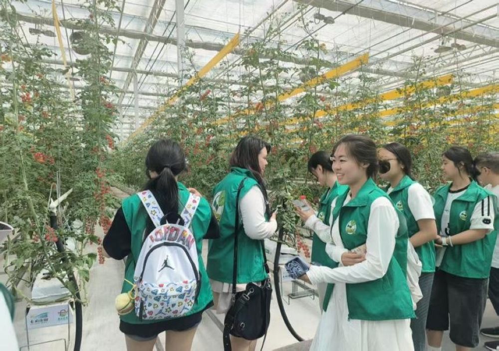 首先讲解员带领实践队走进寿光标准化蔬菜大棚,这里堪称“植物生长的智能工厂”。在技术人员的引导下,队员们看到了大棚内运用物联网系统精准调控温度、湿度、光照和CO₂浓度,无土栽培、滴灌施肥等技术让各类蔬菜长势喜人的现象,这生动展现了科技如何让传统农业焕发高效与优质的双重活力。