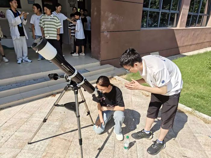 踏入校园,实践团成员便带着教具与热忱。首先是望远镜安装与使用讲解开启 “追星” 篇章。实践团成员详细展示安装步骤,从三脚架搭建到目镜调试,一步步演示,讲解光学原理,让同学们明白 “如何捕捉星星” 。安装完成,同学们有序体验,透过目镜,尝试找寻太阳踪迹,当看到带有黑点的白色圆盘时兴奋无比,宇宙的神秘,在望远镜目镜里,向孩子们悄然敞开。