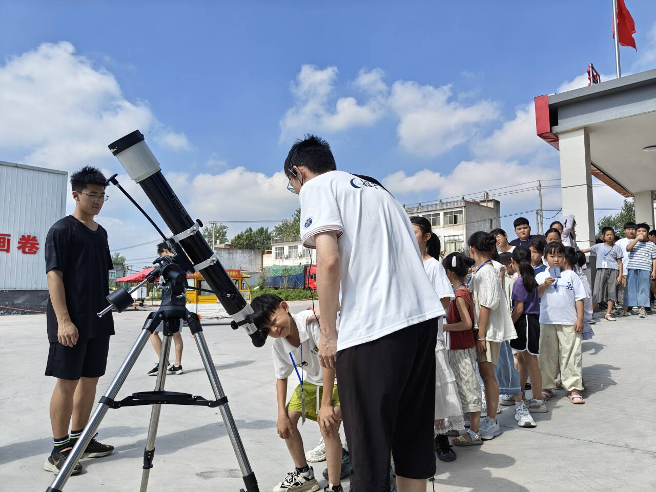 随后,石炜凡同学为孩子们详细讲解天文望远镜的原理及使用方法,并与队友、志愿者们一同组织太阳黑子观测活动。孩子们通过望远镜近距离观察太阳表面细节,亲身感受天文的魅力,让理论知识在实践中得到深化。