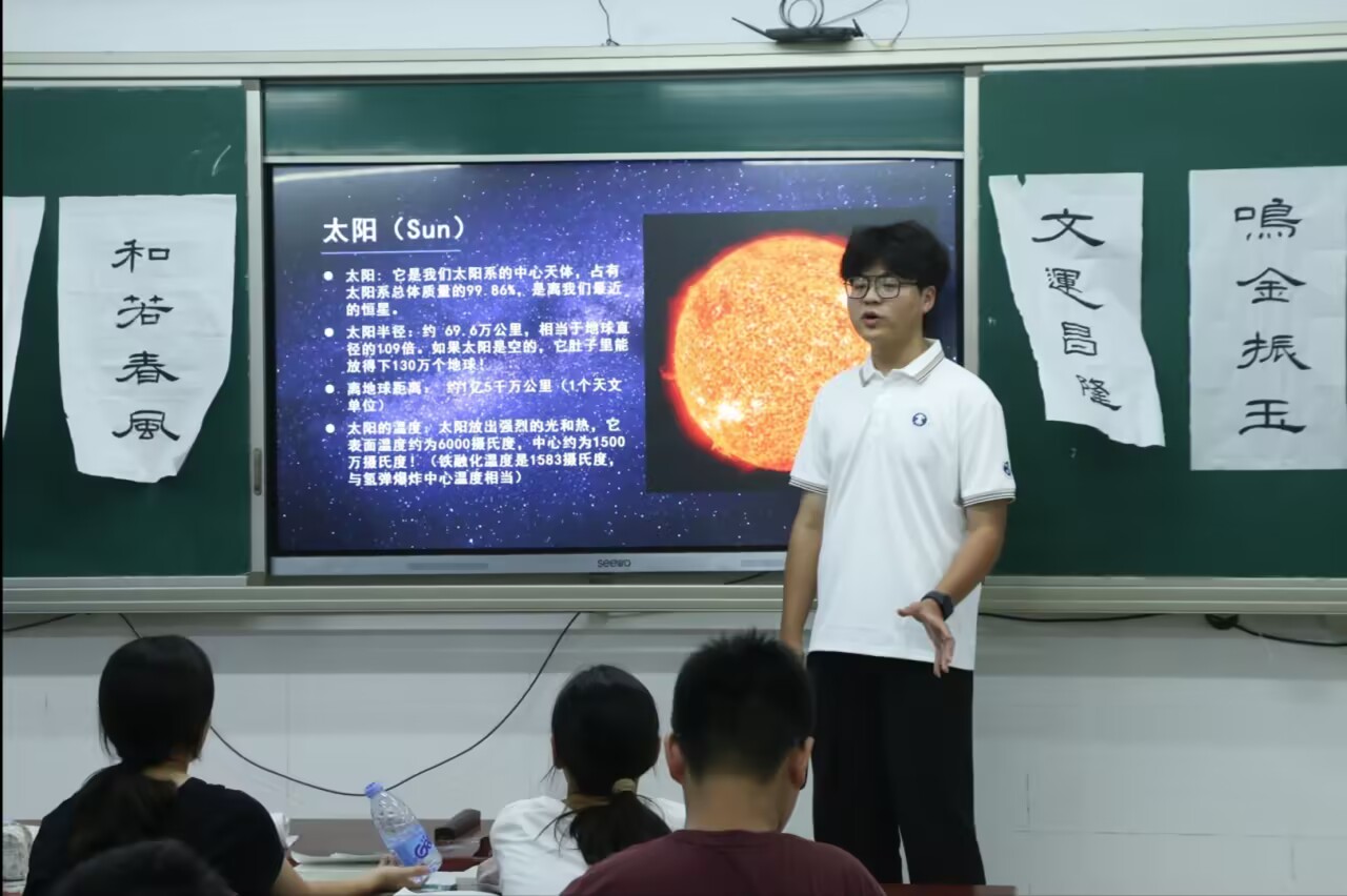 下午的活动在鹿鸣学校和东北社区同步展开。王属程同学和庄欣瑶同学以"太阳系探秘"为主题,通过精美的天体模型和动态演示,带领孩子们遨游太阳系八大行星,让他们了解我们所生活的星系,完善青少年对世界的认知。