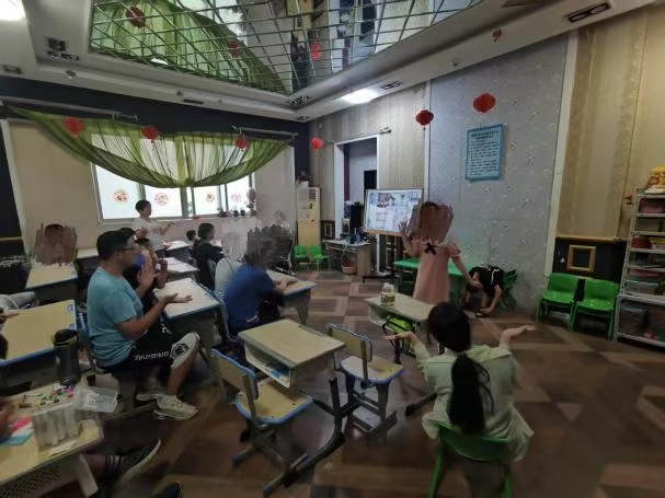 串珠活动结束后,康复中心里音乐响起。社会实践团队成员与残障小朋友们共同舞蹈。团队成员看着孩子们,他们手势起初有些凌乱。但他们的眼神紧紧交汇,传递着鼓励。在旋律中,孩子们渐渐放松,开始享受舞蹈。孩子们的动作从僵硬变得自然,从怯弱变得自信。团队成员与孩子们的身影在音乐中交错、重叠,仿佛形成了一幅唯美的画。此刻,时间仿佛停止,只有康复中心内的音乐与欢笑。