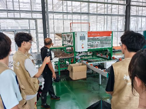 进入园区后,连栋智能温室内的温湿度检测器、自动遮阳卷帘等设备有序运转,薄膜连栋温室内种植的蓝莓及育苗棚内的小白菜幼苗生长状况良好。实践队成员围绕滴灌喷头间距、不同生长期水肥配比等技术细节,与负责人进行了深入交流。