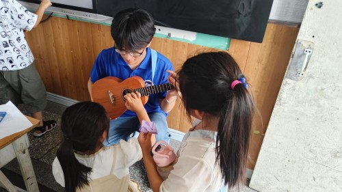 图为宣讲团成员唐海诚指导孩子们乐器使用。大学生网报通讯员孙佳伦供图