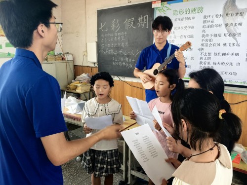 图为宣讲团成员向俊宇带领孩子们一起唱歌。大学生网报通讯员孙佳伦供图