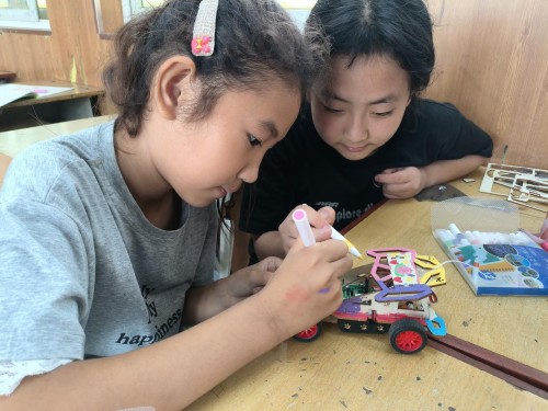 图为孩子们对小车进行涂色。大学生网报通讯员孙佳伦供图